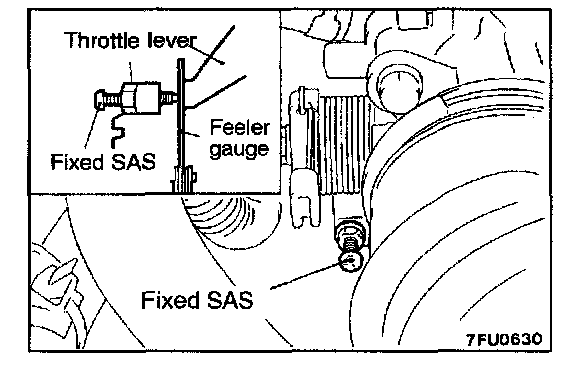 2. Insert a feeler gauge with a thickness of 0.45 mm (0.177 in.) between the fixed SAS and the throttle lever.