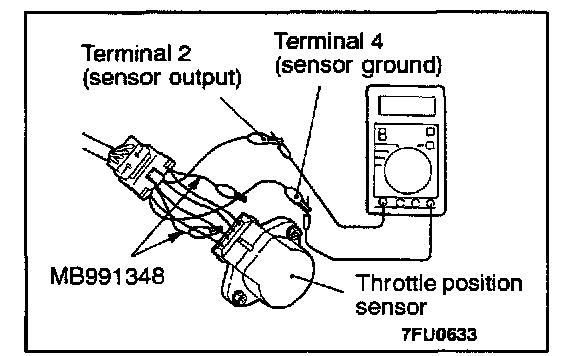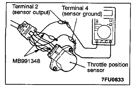 2. Connect a digital voltmeter between the throttle position sensor terminal 2 (sensor output) and terminal 4 (sensor ground.)