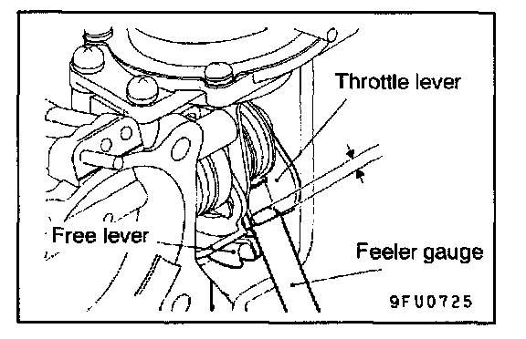 NOTE: The throttle lever opening will widen larger than the set opening if the feeler gauge is inserted more than 3 mm (.12 in.), and adjustment will be impossible.
