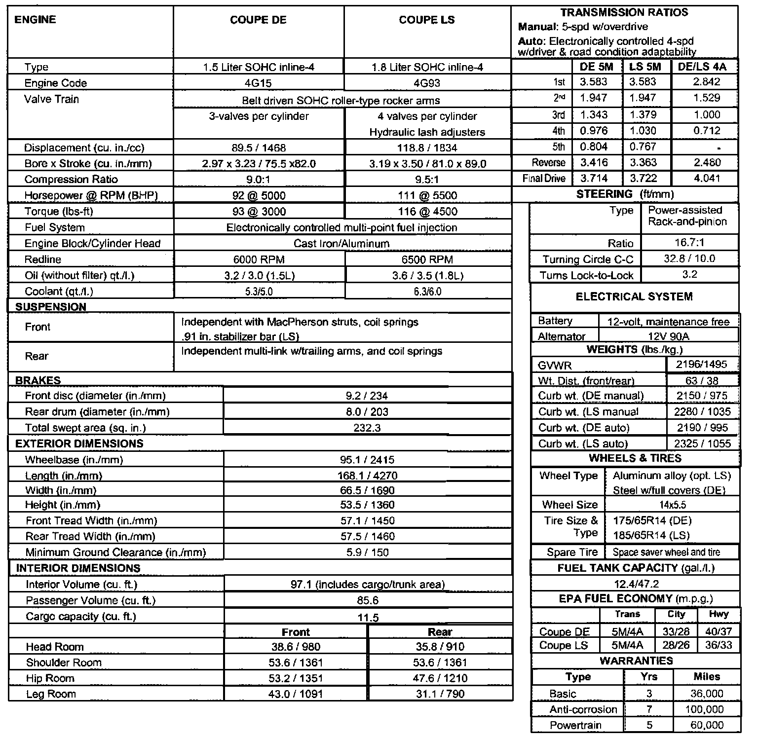 2002 MIRAGE COUPE TECHNICAL SPECIFICATIONS