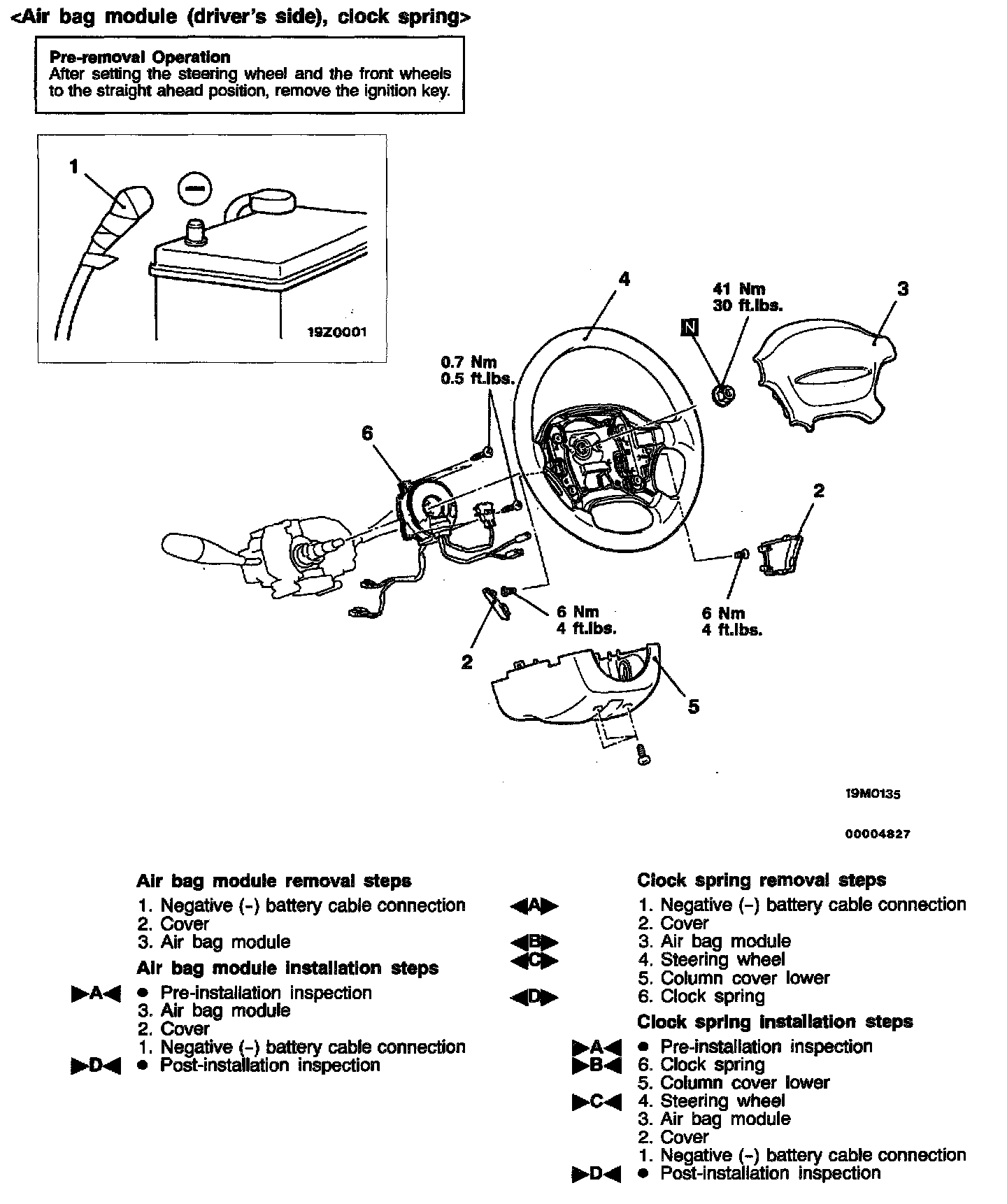 5. After deployment of an air bag, replace the air bag modules. Inspect the clock spring, and replace it with a new part if it is faulty.