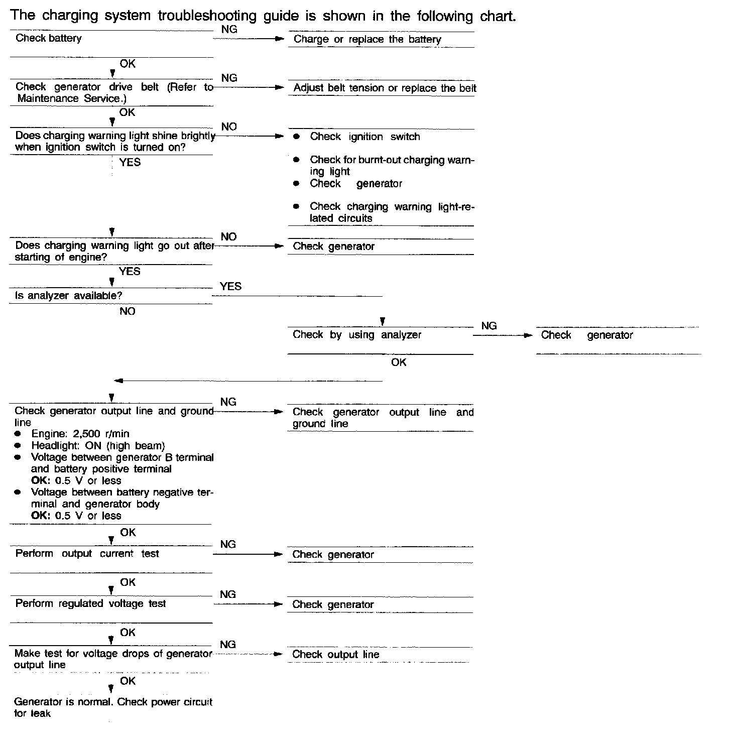 1. Charging warning light does not go on when the ignition switch is turned to "ON" before the engine starts.- Check the bulb.