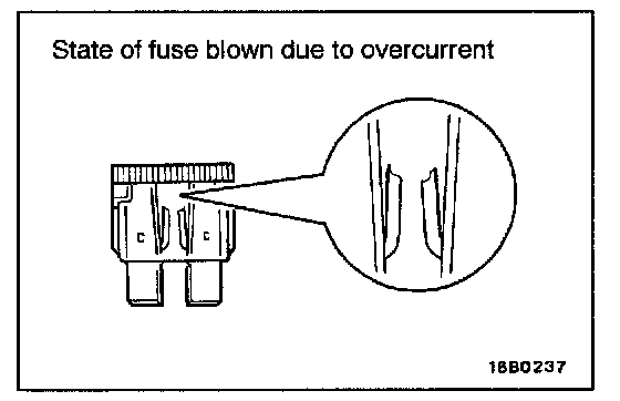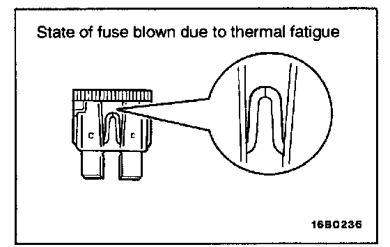 When a fuse is blown, there are two probable causes as follows: One is that it is blown due to flow of current exceeding its rating. The other is that it is blown due to repeated on/off current flowing through it. Which of the two causes is responsible can be easily determined by visual check as described below.