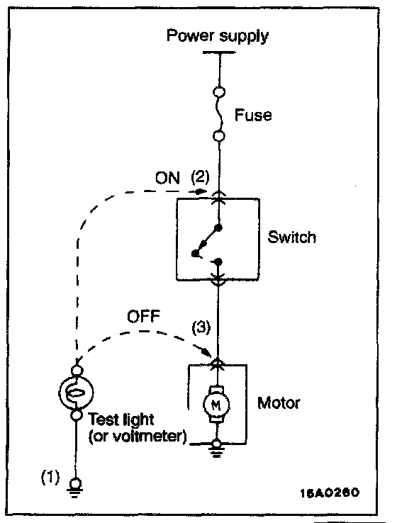 1. Ground one lead wire of the test light. If a voltmeter is used instead of the test light, ground the grounding side lead wire.