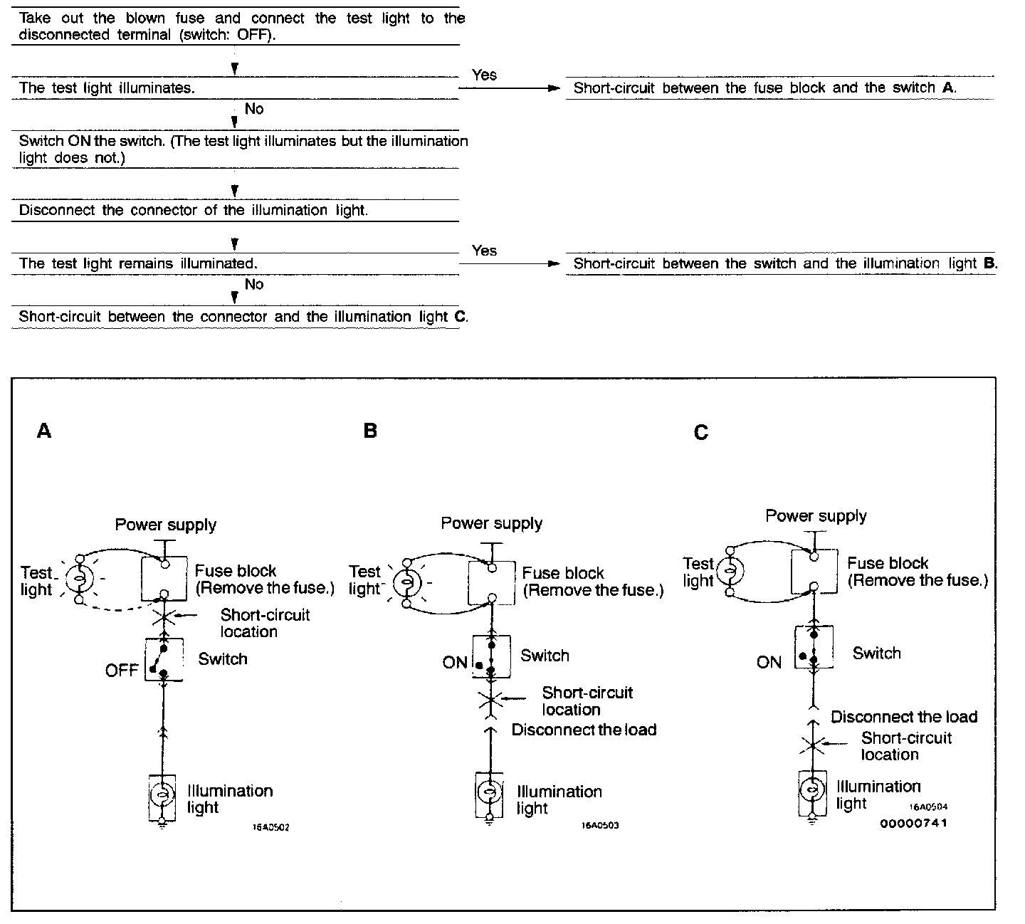 Because the fuse has blown, it is probable that there is a short circuit. Follow the procedures below to narrow down the short-circuit location.