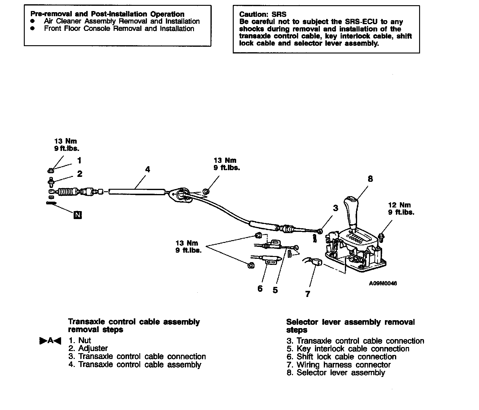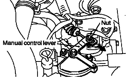 2. Loosen the adjusting nut, gently pull the transaxle control cable in the direction of the arrow and tighten the nut.