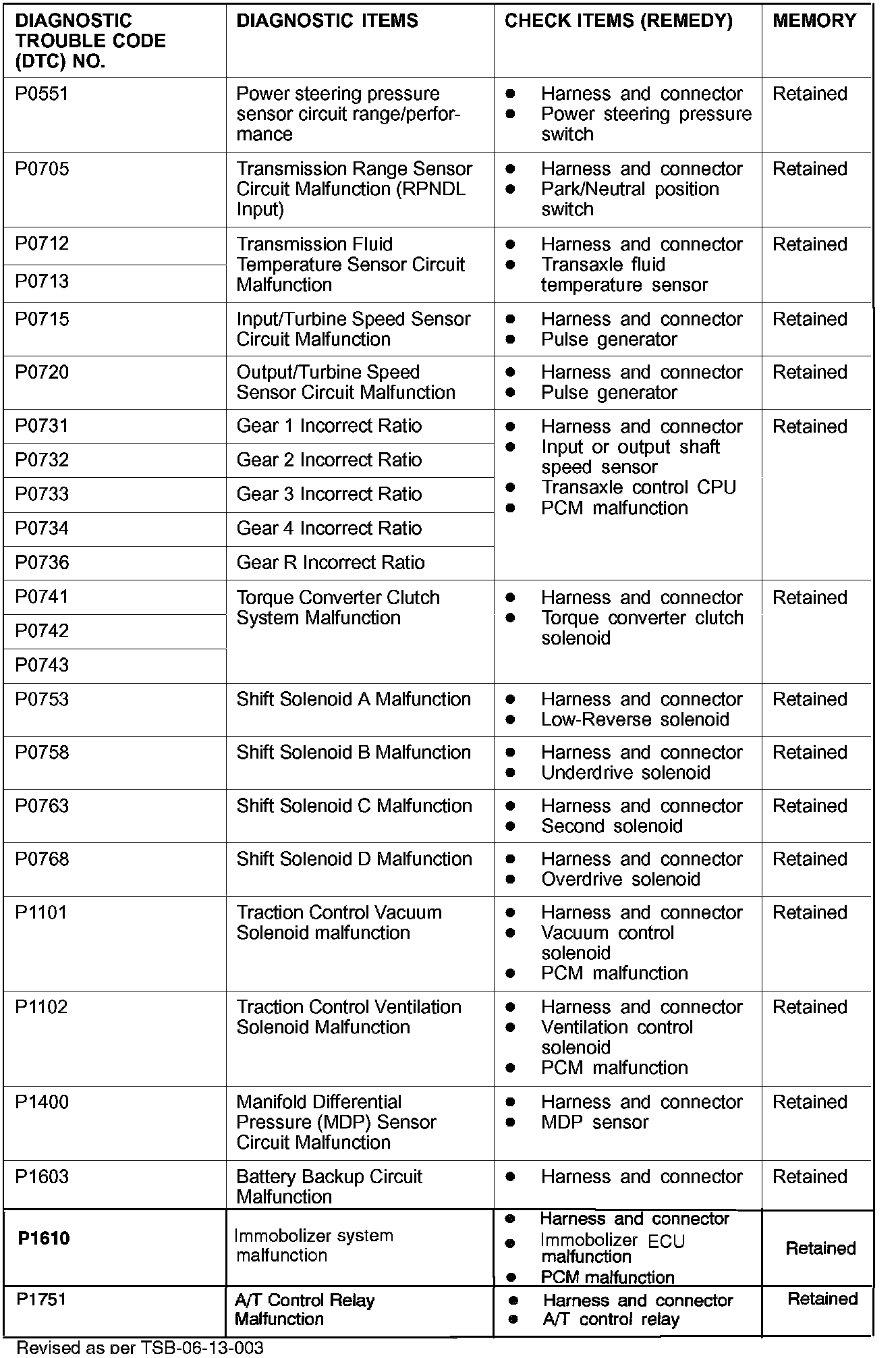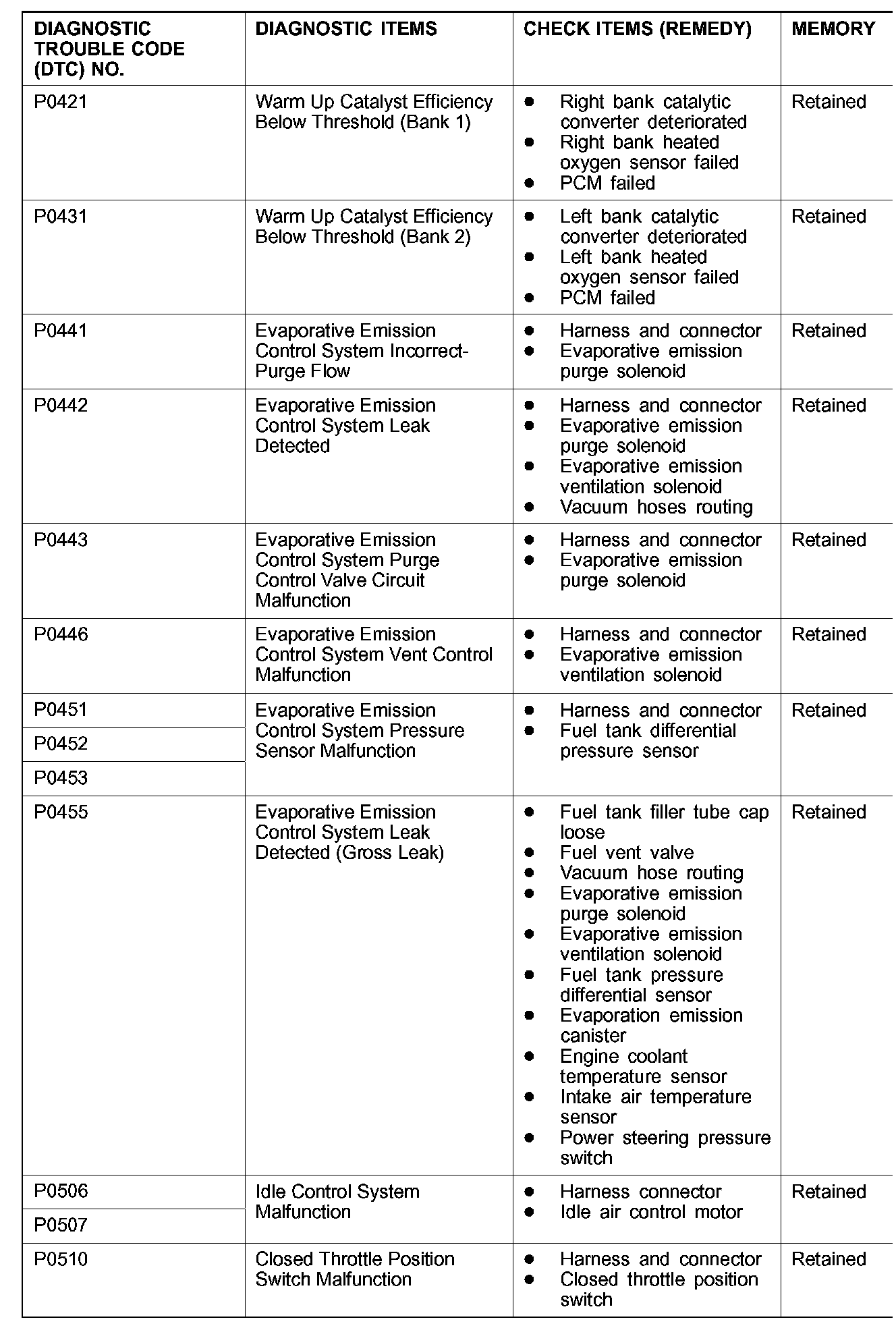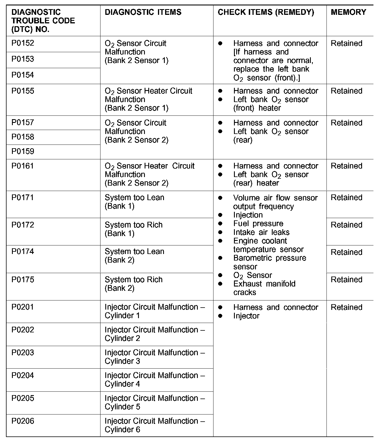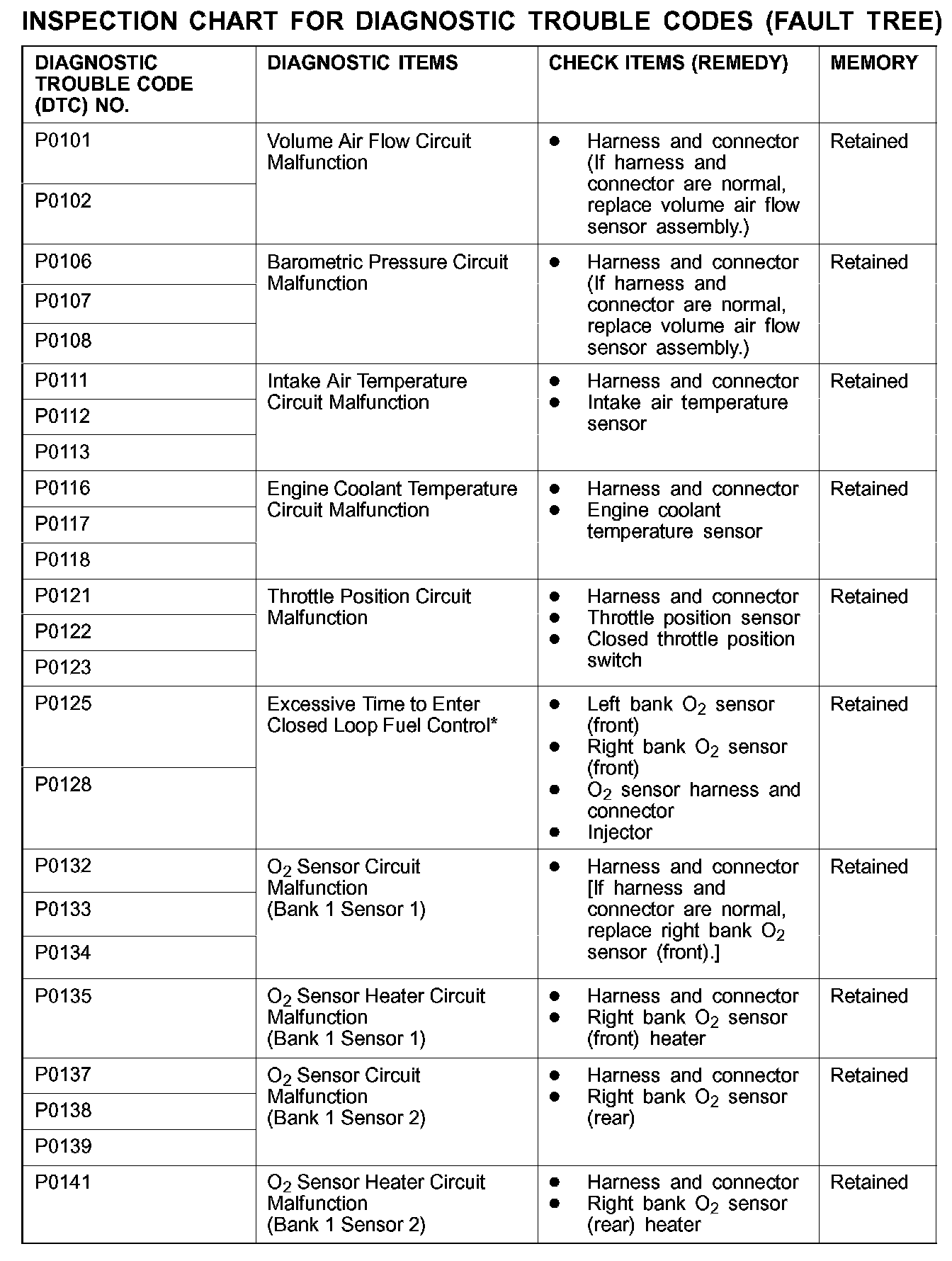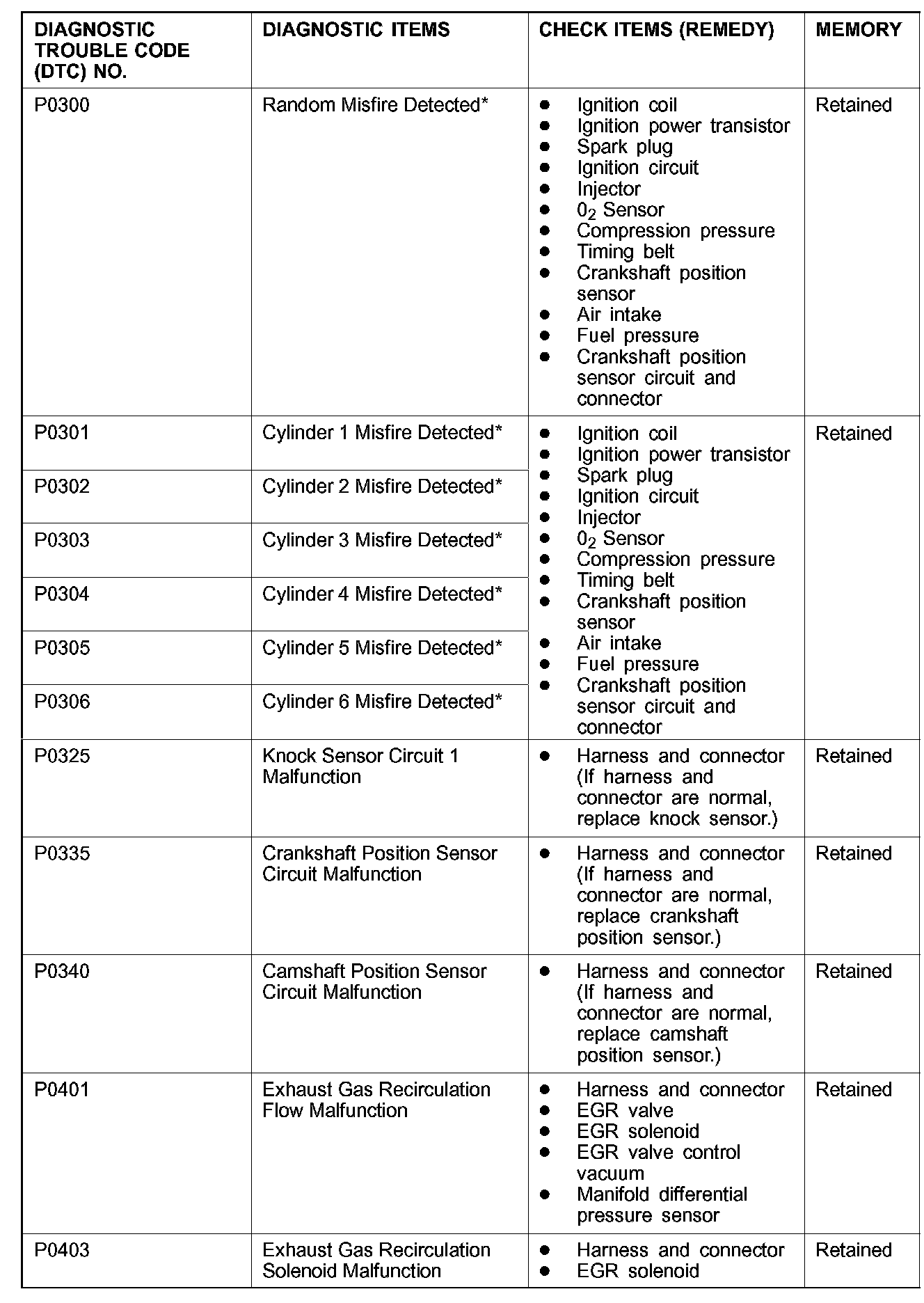 NOTE: After the PCM detects a malfunction, a diagnostic trouble code is recorded when the engine is next started and the same malfunction is re-detected. However, for items marked with a "*", the diagnostic trouble code is recorded on the first detection of the malfunction.
