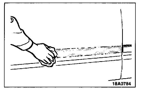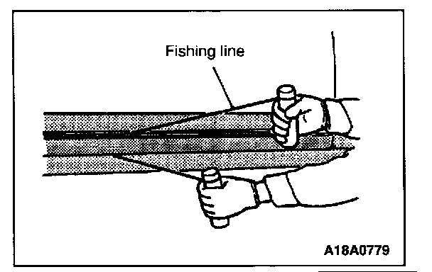 2. Insert fishing line [Dia 0.8 mm (.03 in.)] between the body and the side protector molding, and pull both ends alternately to cut the adhesive section and remove the side protector molding.