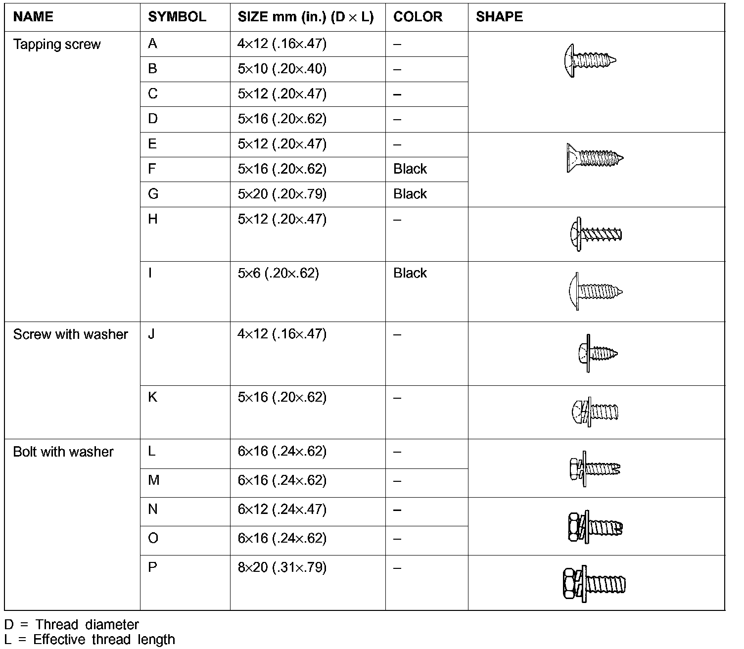 For installation of the instrument panel, the bolts and screws described below are used. They are indicated by symbols in the illustration.