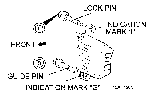 Install the guide pin and lock pin as illustrated so that each head mark of the guide pin and the lock pin matches the indication mark located on the caliper body.