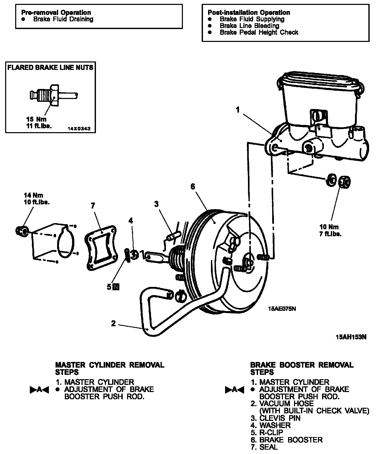 CAUTION: After removing the master cylinder from the brake booster, care must be taken not to disturb the pushrod and not to depress the brake pedal after the master cylinder is removed. Failure to observe this caution may result in the brake booster re-action disc becoming dislodged inside the brake booster.