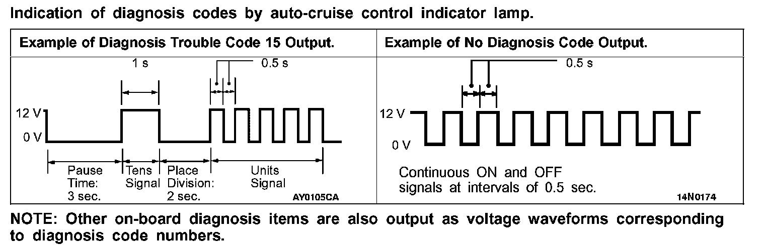 2. Read a diagnosis code by observing the flash display pattern of the auto-cruise control indicator lamp in the combination meter.