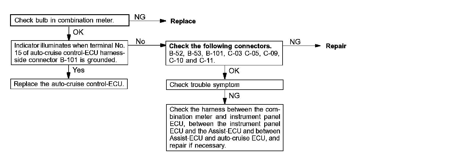 Auto-cruise control indicator inside combination meter does not illuminate. (However, auto-cruise control is normal.)Comment