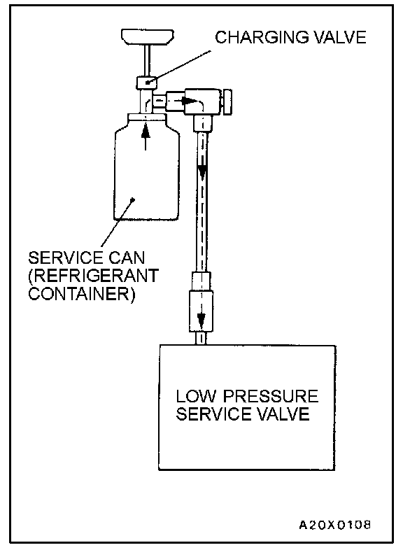 CORRECTING LOW REFRIGERANT LEVEL IN CASE THE SERVICE CAN IS USED1. Install the charge valve with the handle turned all the way out (valve open) of the service can.