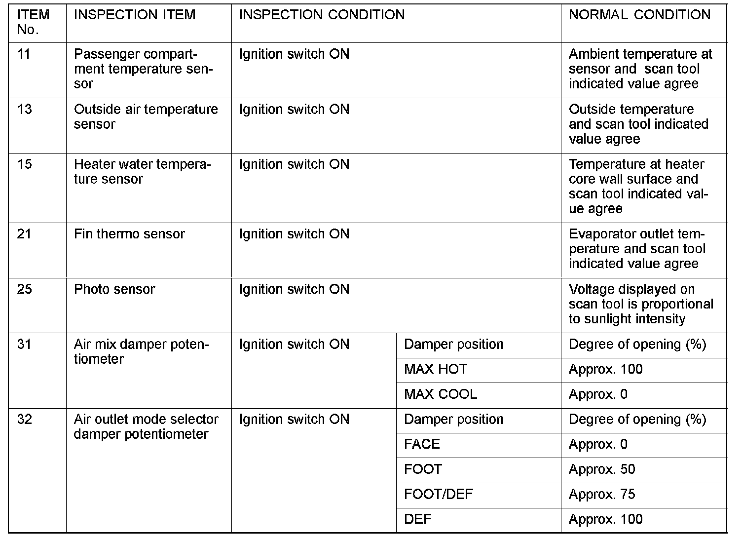 Service Data Reference Table: