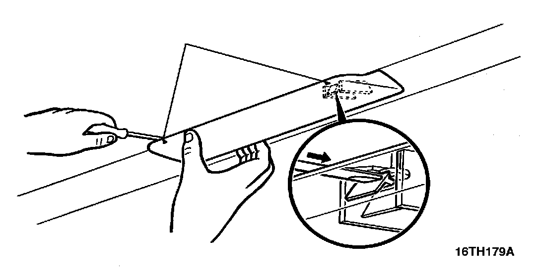 2. Push the screwdriver in until the retainer clip releases from the glass mounting clip and move the lamp toward the rear. Repeat this step at the other side of the lamp.