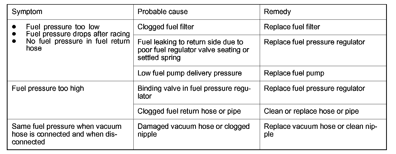 12. If any of fuel pressure measured in steps 8 to 11 is out of specification, troubleshoot and repair according to the table.