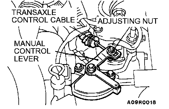 6. Gently pull the transaxle control cable in the direction of the arrow, and then tighten the adjusting nut.