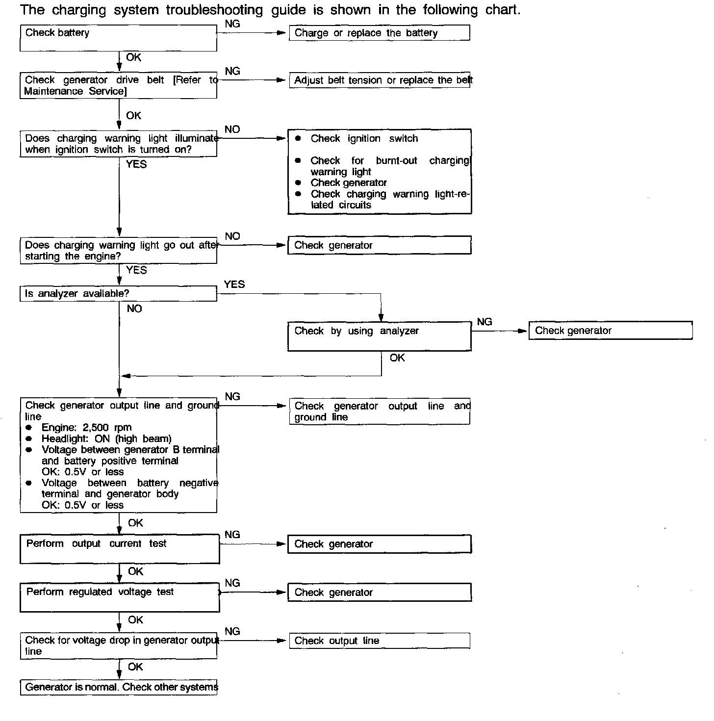 TROUBLESHOOTING HINTS1. Charging warning light does not go on when the ignition switch is turned to "ON", before the engine starts.