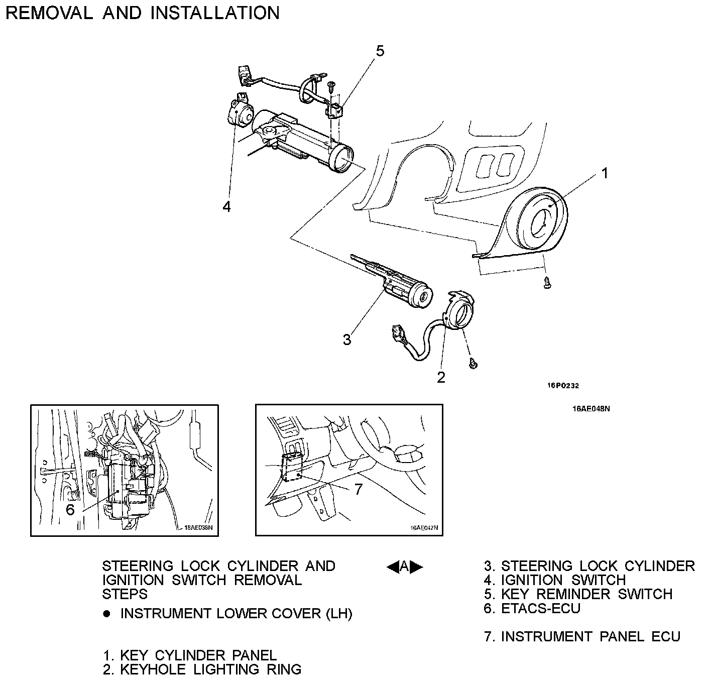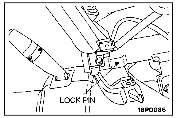 2. Using a cross-tip (+) screwdriver (small) or a similar tool, push the lock pin of the steering lock cylinder inward and then pull the steering lock cylinder toward you.