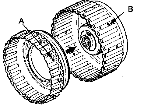 1. Align the space between the teeth (part A) of the clutch plate, clutch disc and clutch reaction plate to the outer circumference hole (part B) of the reverse clutch retainer.