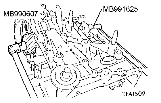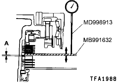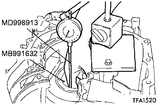 14. Install the special tool (MD998913) in a dial gauge, and then move the special tool (MB991632) to measure the axial play.