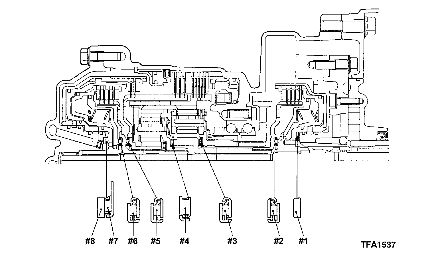 7. Replace the pressure plate of the low-reverse brake with the special tool, and then install the (6) brake discs, (5) brake plates and snap ring as shown in the figure.
