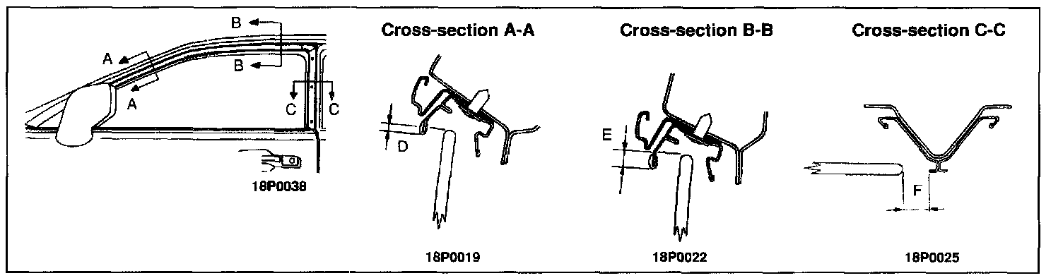 3. Mark the tape on the "B" pillar 100 mm from the top and 100 mm from the bottom. Measure from "B" pillar to the edge of the glass in both positions. This will give cross section C-C Measurement "F" (glass margin).