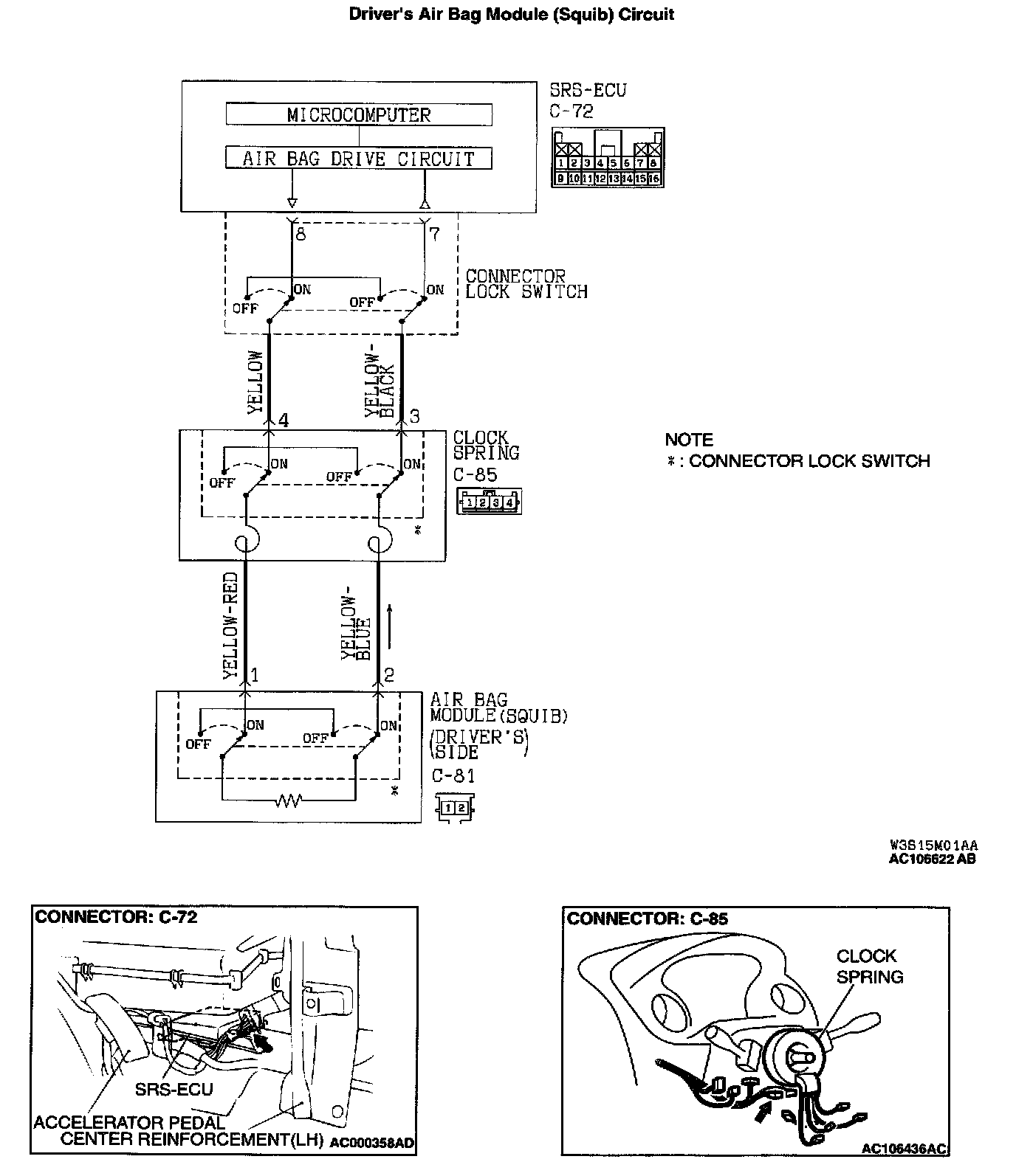 NO: Repair the harness wires between SRS-ECU connector C-72 and clock spring connector C-85.