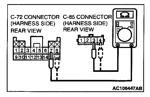 4. Insert special tool MB991866 into clock spring harness side connector C-85 (terminal No.3 and 4) by backprobing.