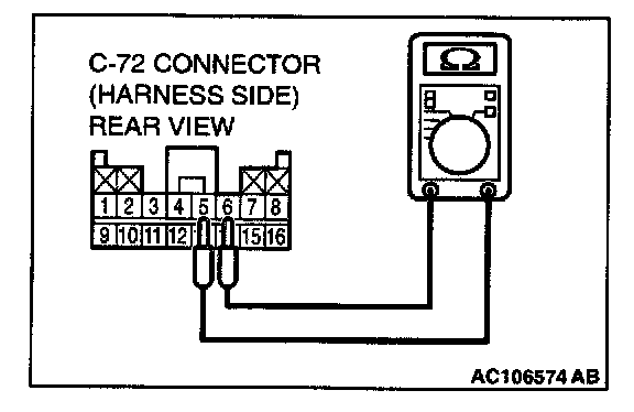 STEP 6. Check the harness for short circuit between SRS-ECU connector C-72 (terminal No.5 and 6) and passenger's side air bag module connector C-11 (terminal No.1 and 2).