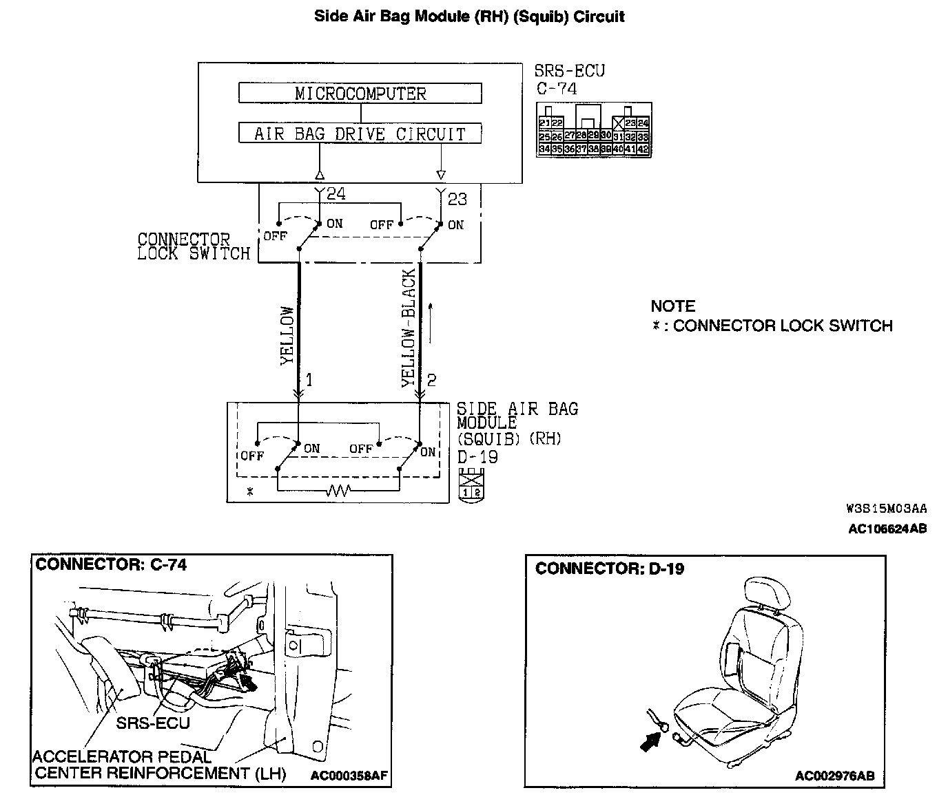 NOTE: *: The squib circuit connectors integrate a "short" bar (which prevents the air bag from deploying unintentionally due to static electricity by shorting the positive wire to the ground wire in the squib circuit when the connectors are disconnected). Therefore, if connector C-74 or D-19 is damaged or improperly engaged, the short bar may not be released when the connector is connected.