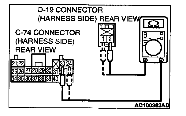 1. Disconnect SRS-ECU connector C-74 and side-airbag module (RH) connector D-19, and measure at the wiring harness side.
