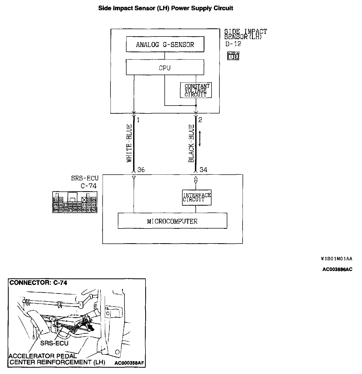 STEP 2. Check the harness wires for open circuit or short circuit between SRS-ECU connector C-74 (terminal No.34 and 36) and side impact sensor (LH) connector D-12 (terminal No.1 and 2).