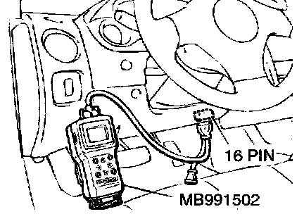 CAUTION: To prevent damage to scan tool MB991502, always turn the ignition switch to the "LOCK" (OFF) position before connecting or disconnecting scan tool MB991502.