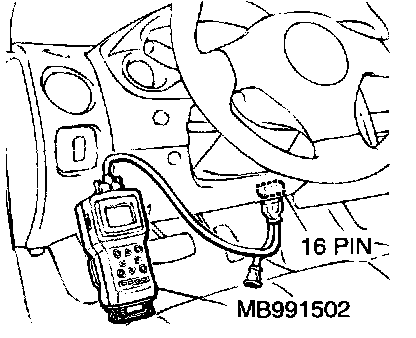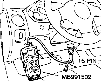 CAUTION: To prevent damage to scan tool MB991502, always turn the ignition switch to the "LOCK" (OFF) position before connecting or disconnecting scan tool MB991502.
