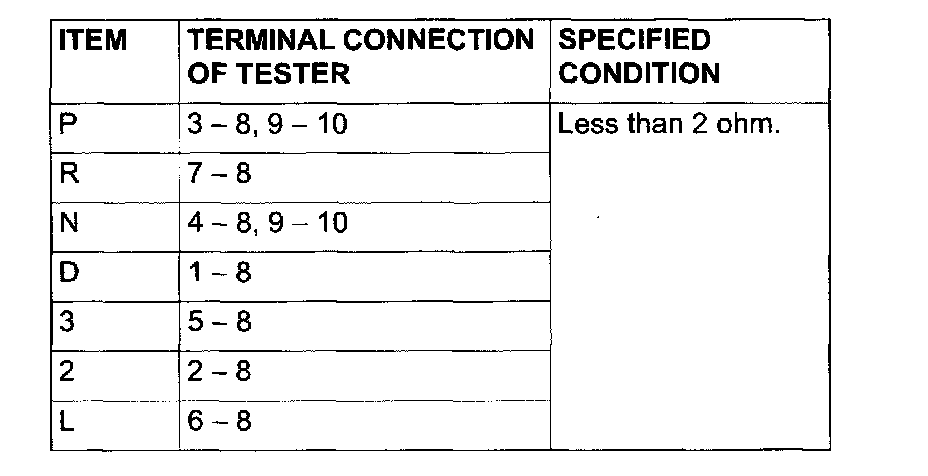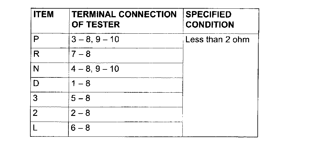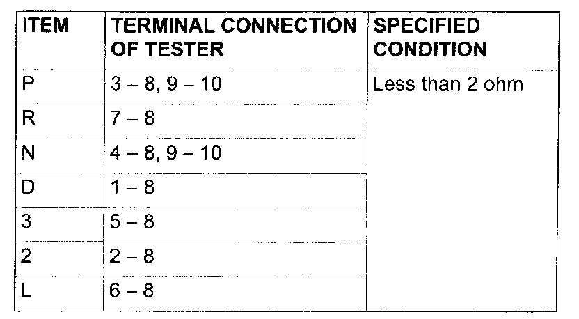 ^ Battery positive voltage is applied to the PCM terminal 108 (121, 102, 109, 122 or 110) when the selector lever is in the "R" range ("N." "D," "3," "2" or "L" range). The PCM judges that the selector lever is in the "R" range ("N." "D," "3," "2" or "L" range) when the battery positive voltage is applied.
