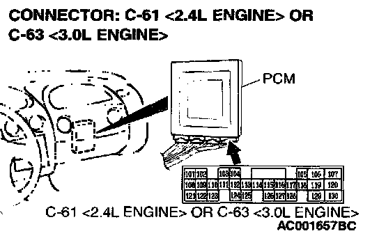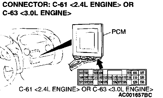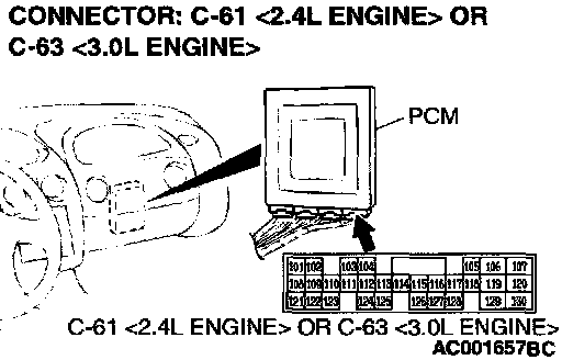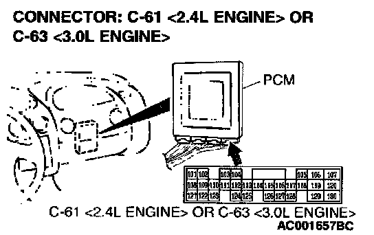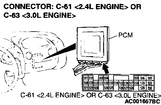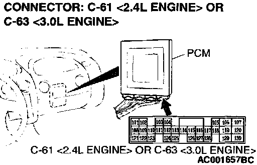 STEP 16. Check connector C-61 <2.4L Engine> or C-63 <3.0L Engine> at PCM for damage.