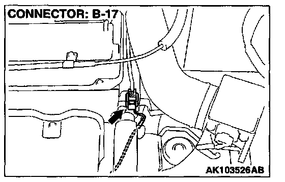 1. Disconnect the heated oxygen sensor (front) connector B-17 and connect test harness special tool, MD998464, to the connector on the heated oxygen sensor (front) side.