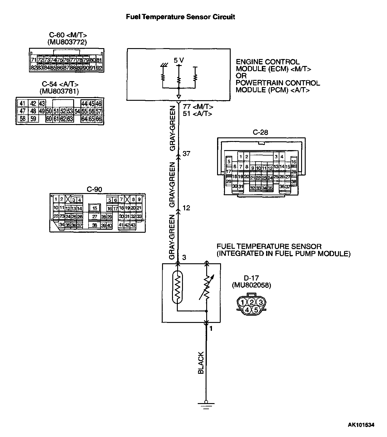 - 5-volt voltage is applied to the fuel temperature sensor output terminal (terminal 3) from the ECM (terminal 77)