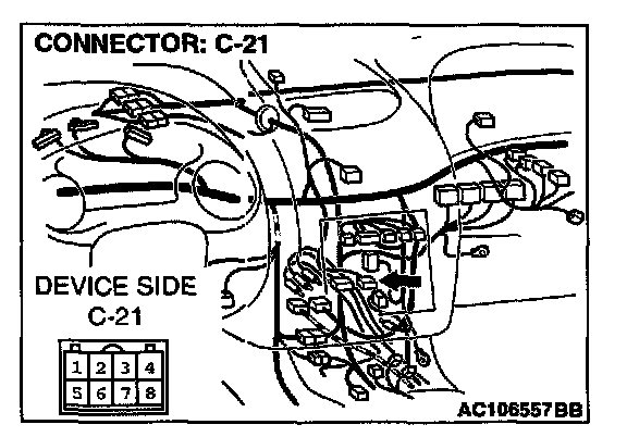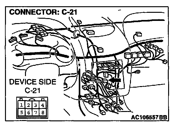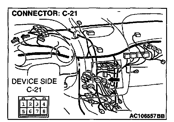 STEP 2. Radio and CD player connector C-21 and clock spring connector C-84 for damage.