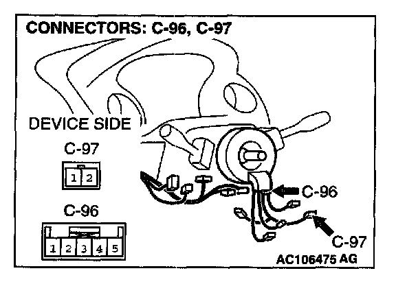 STEP 9. Check the wiring harness between clock spring connector C-96 (terminals 4 and 5) and switch (RH) connector C-97 (terminals 1 and 2).