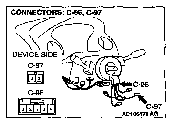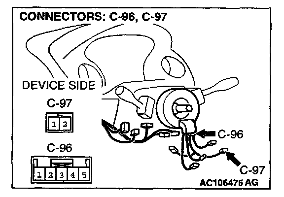 STEP 3. Check the wiring harness between remote controlled radio switch connector C-97 (terminals 1 and 2) and clock spring connector C-96 (terminals 4 and 5).
