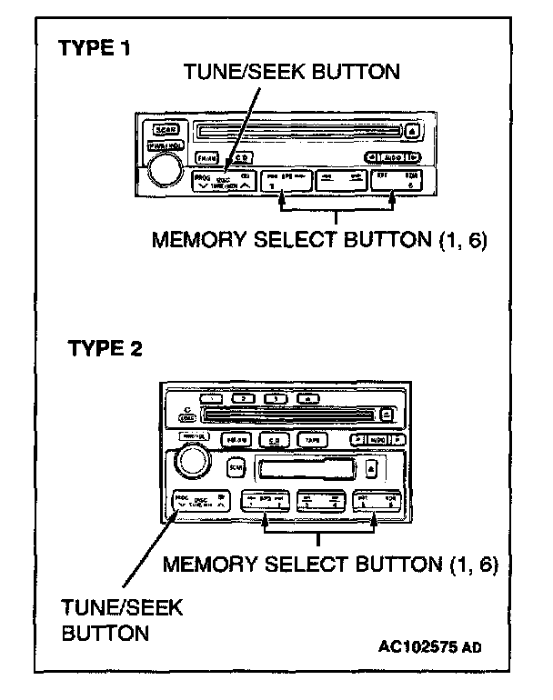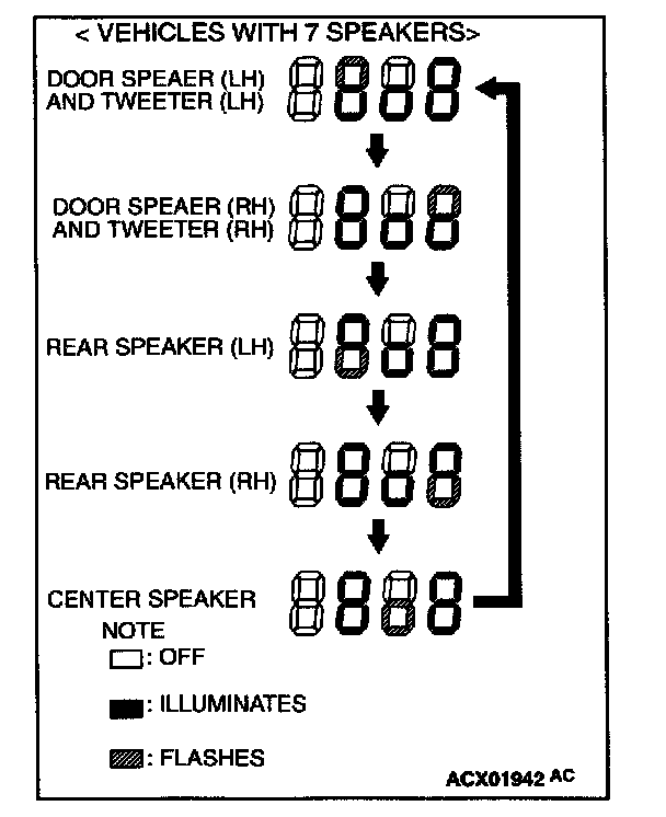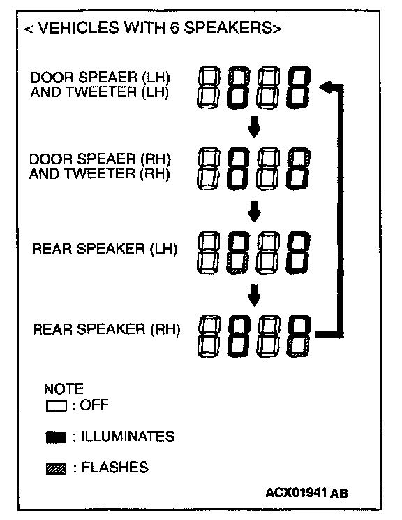 4. If a button other than the memory select "6" button and "EJECT" button (tape or CD) is pressed, or the ignition switch is turned to "LOCK" (OFF) position, you will exit from the speaker test mode.
