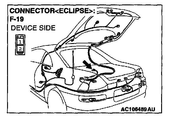 STEP 34. Check the wiring harness between rear speaker (RH) connector F-19 (terminal 1 and 2)