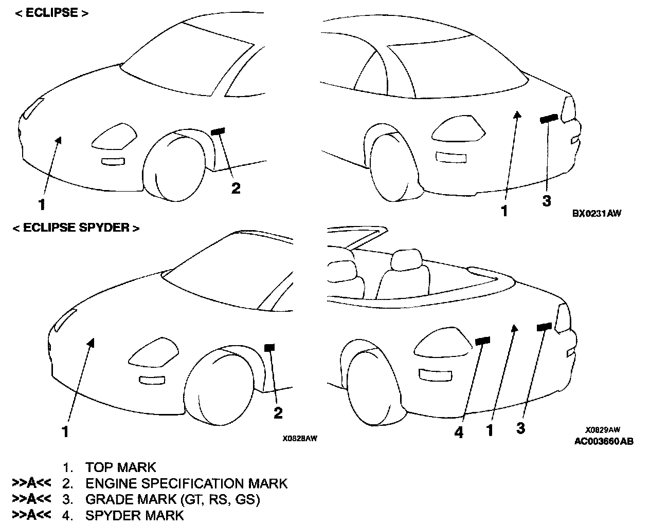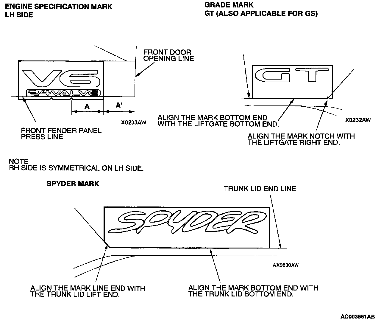 3. Make sure that air bubbles are not trapped in the application surface. When applying the mark, use special tool MB990528 to press the mark from its center to top and bottom gradually.