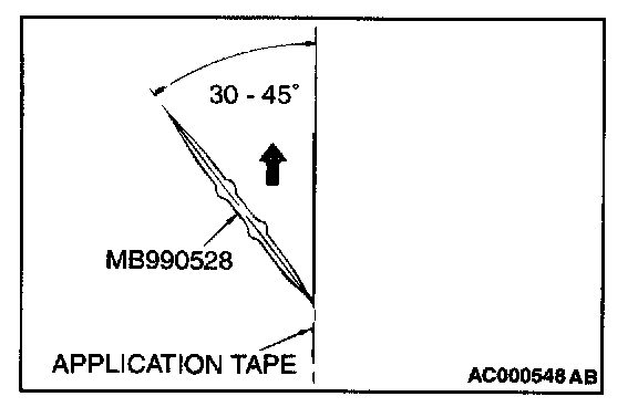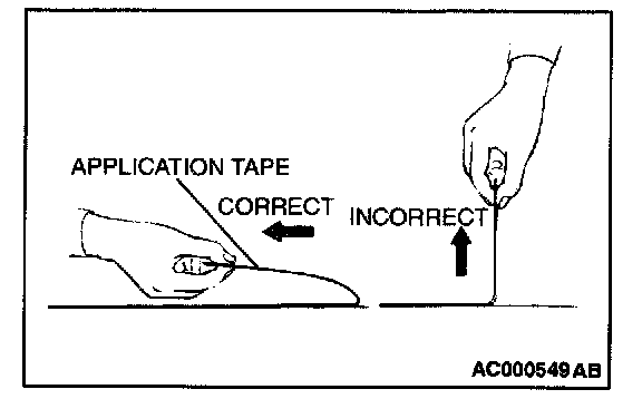 4. Peel off an application tape (top protection paper) horizontally and carefully from one end. If an air bubble is left in the mark, open a hole by using a needle, and then use special tool MB990528 to expel the air bubble.