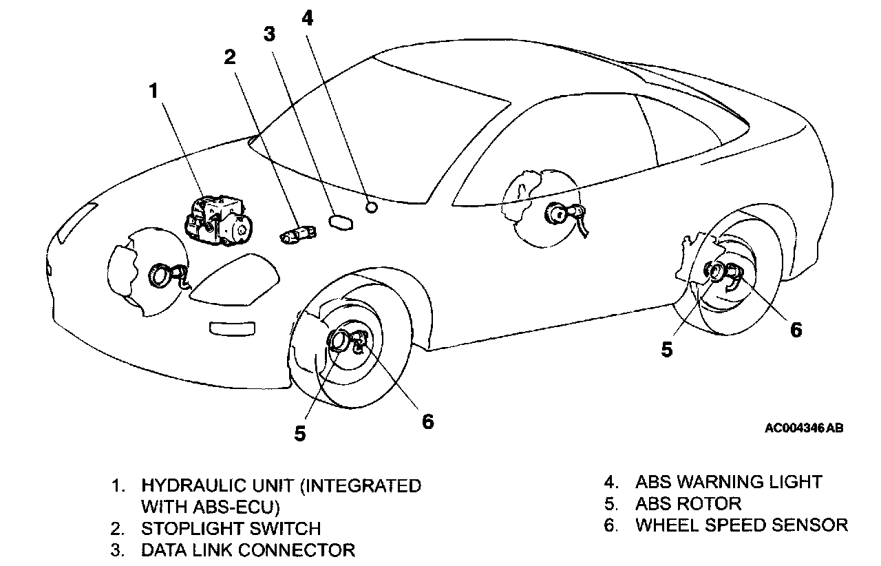 GENERAL DESCRIPTIONThe ABS consists of components such as the wheel speed sensors, stoplight switch, hydraulic unit assembly (integrated with ABS-ECU),ABS rotor, and the ABS warning light. If a problem occurs in the system, the malfunctioning components can be identified and the trouble symptoms will be memorized by the diagnostic function.