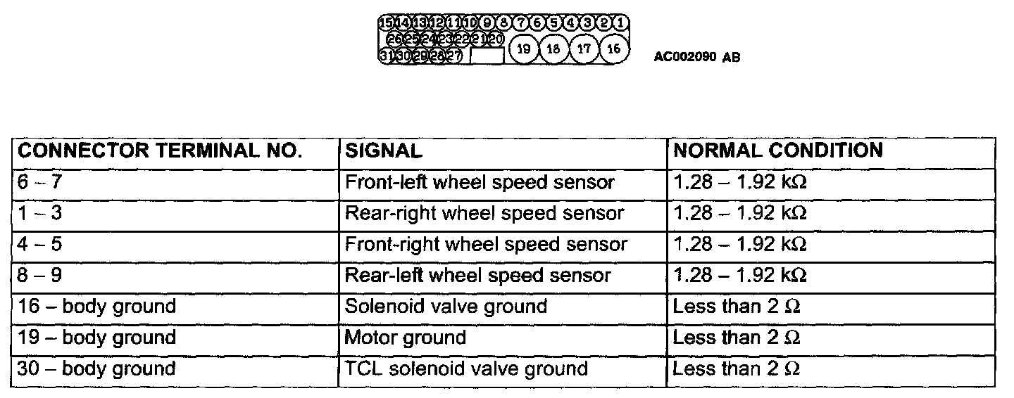 1. Turn the ignition switch to the "LOCK" (OFF) position and disconnect the ABS-ECU connector before checking resistance and continuity.