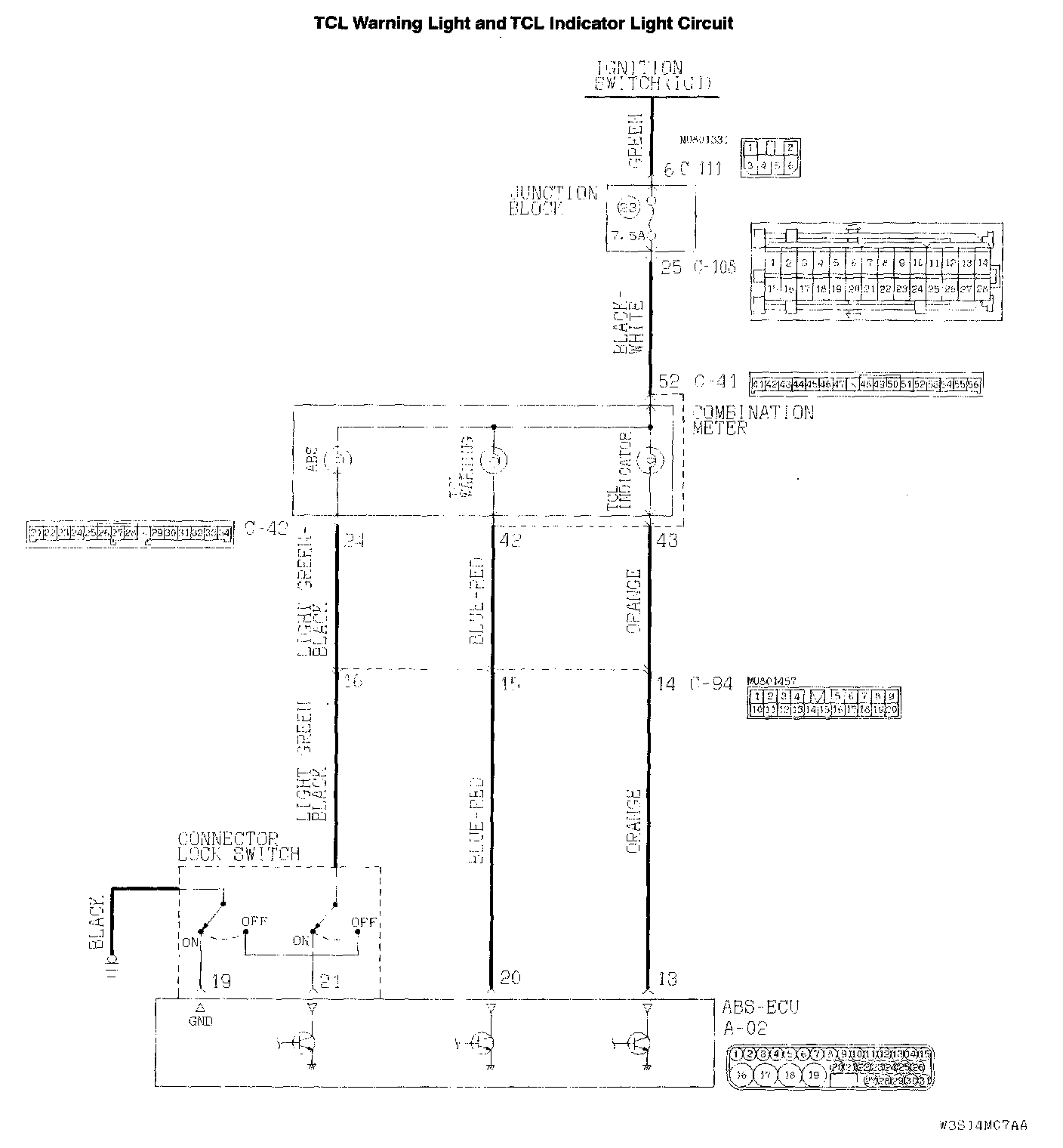 ^ Power to the TCL warning light is supplied from the ignition switch. The ABS-ECU grounds the circuit to illuminate the light.